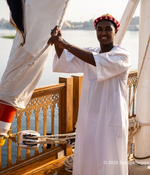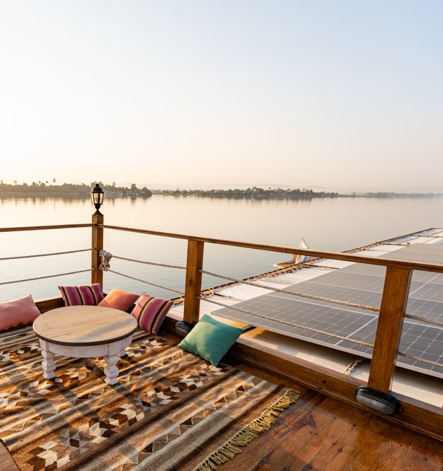 Die 49 Meter lange Dahabiya Escaleeh wurde 2023 gebaut und verkehrt seit Herbst 2024 zwischen Luxor und Assuan. Sie verfügt über nur acht Doppelkabinen und zwei Suiten, die alle auf dem Hauptdeck angeordnet sind und maximal für 20 Gäste Platz bieten. Das Platzangebot ist damit besonders großzügig, denn normalerweise haben Dahabiyas dieser Größe mehr Kabinen.